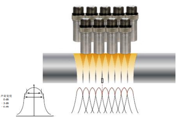 使用常規超聲技術時,即使筆刷式超聲探頭能在一次旋轉中檢測較大的區域(寬度),但因為每個探頭的聲束之間并沒有物理交疊,因此缺陷的探出率依然很低。雖然使用兩排常規超聲探頭時可以增加超聲聲束的覆蓋率,但坯材中能量密度的相對嚴重的不均衡狀態依然存在。這樣坯材中的某些區域會接收到較低的超聲聲束能量,探出該區域中細小缺陷的能力也隨之減弱。